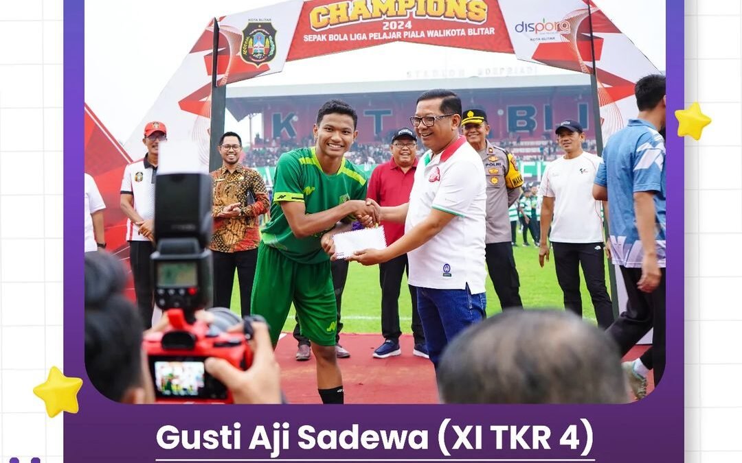 Selamat kepada Gusti Aji Sadewa dari kelas XI TKR 4 atas pencapaian luar biasa sebagai Pemain Terbaik dalam Kompetisi Liga Pelajar Walikota Cup 2024! Prestasi ini menunjukkan dedikasi, ketekunan, dan kemampuan luar biasa yang dimiliki Gusti di lapangan hijau. Tidak hanya membanggakan SMK Islam 1 Blitar, tetapi juga menjadi inspirasi bagi teman-teman sebaya.