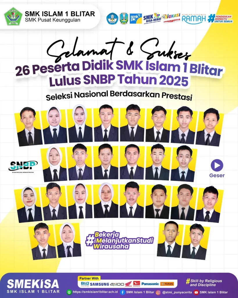 Blitar, 18 Maret 2025 – Kabar menggembirakan datang dari keluarga besar SMK Islam 1 Blitar. Sebanyak 26 peserta didik berhasil lolos Seleksi Nasional Berdasarkan Prestasi (SNBP) tahun 2025 dan diterima di berbagai perguruan tinggi negeri favorit di Indonesia.
