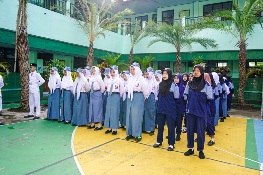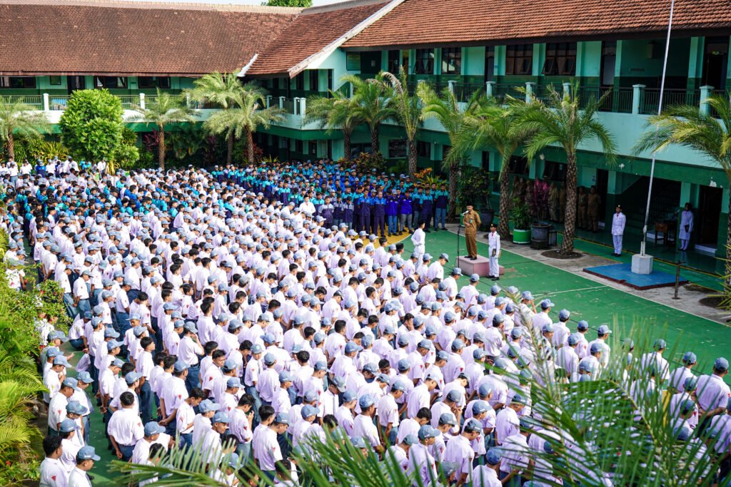 Dengan langit yang cerah sebagai latar belakang, ribuan siswa, guru, dan para staf sekolah berkumpul dengan khidmat di lapangan tersebut. Mereka mengenakan seragam sekolah dengan bangga, menunjukkan semangat kesatuan dan kebersamaan dalam merayakan momen bersejarah ini.