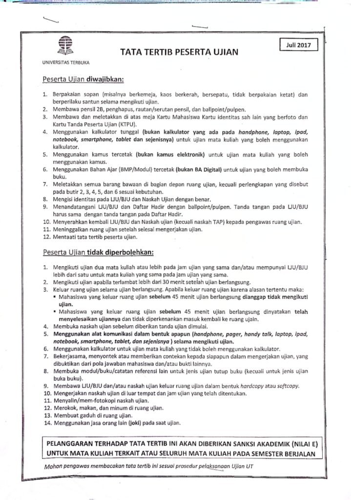 Soal UTM dirancang dalam bentuk tes objektif/pilihan ganda, setiap naskah dan Lembar Jawaban Ujian (LJU) sudah dilengkapi dengan identitas peserta ujian. Pelaksanaan ujian dilakukan melalui tatap muka di lokasi-lokasi ujian yang telah ditentukan oleh UT Daerah. Semoga para mahasiswa dapat menyelesaikan ujian dengan baik dan meraih kesuksesan dalam akademis mereka.